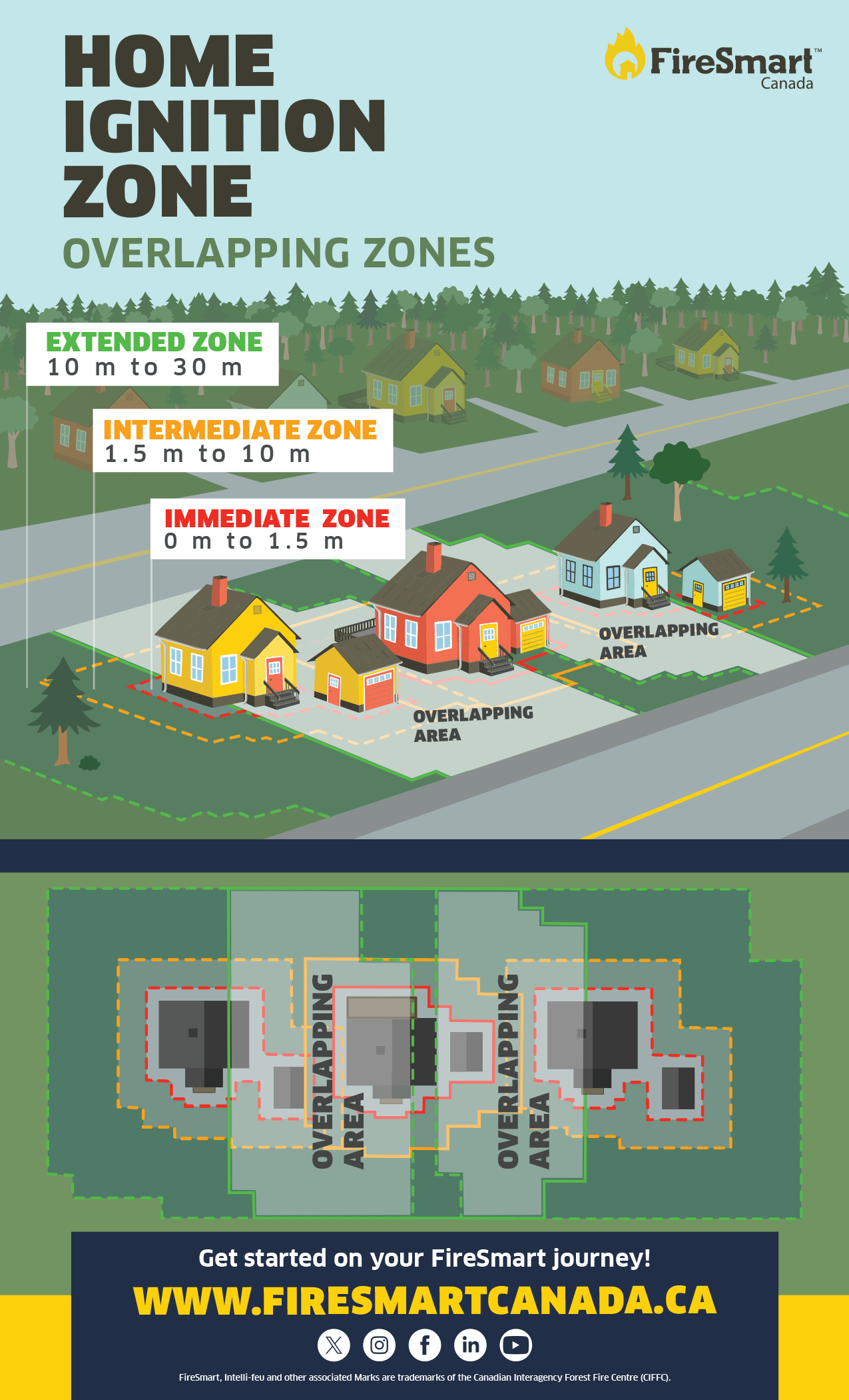 As many neighbourhoods across the country are densely populated, it is very likely that properties will have extended, intermediate or even immediate zones that overlap. When neighbours have overlapping zones, the areas where their properties meet share a heightened risk of ignition during a wildland fire and it is crucial that they work together to reduce risk. Neighbours can enhance the resilience of their their individual properties and that of the entire neighbourhood by working together to reduce risk and remove potential hazards in their overlapping zones.